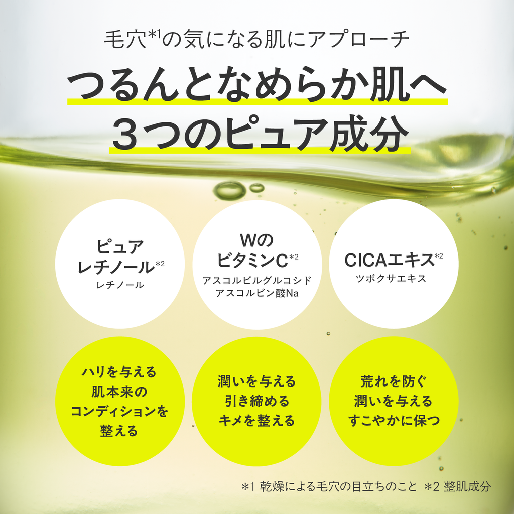 ピュアレチノール※2×WのビタミンC※3×CICA※4、3つの厳選成分を配合し、肌をなめらかに整え、キメの整ったすこやかな肌へ導きます。