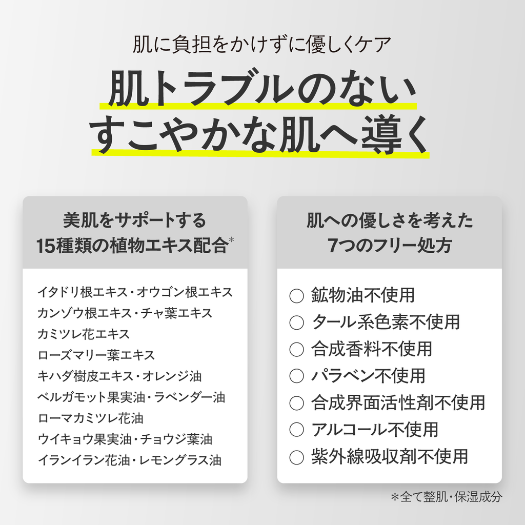 美肌をサポートする15種類の植物エキスと7つのフリー処方※7で、肌に負担をかけずにやさしくケア。本当に必要なものだけを配合したシンプルな処方が、肌トラブルのないすこやかな肌へと導きます。